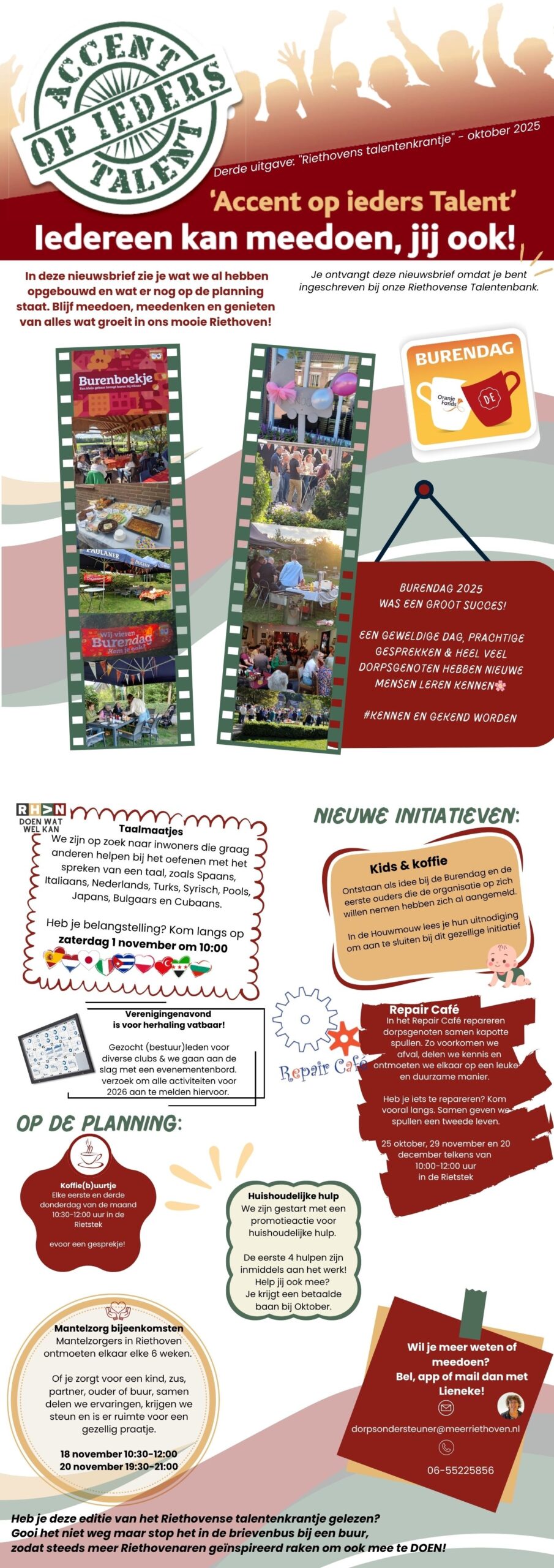 Iedere bewoner en ondernemer in Riethoven heeft een talent. In ons dorp brengen we vraag en aanbod bij elkaar. We zoeken actief naar talenten in ons dorp die het leuk vinden om zich in te zetten voor een mooier Riethoven.